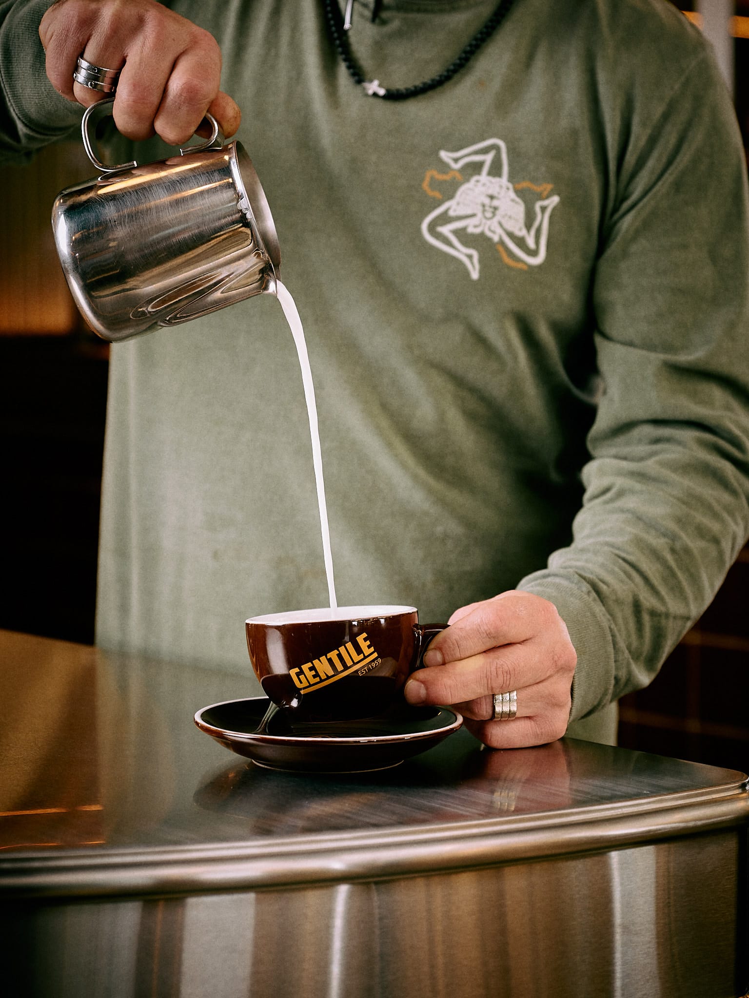 His grandfather Ignazio started the first Gentile café 66 years ago. It was straightforward: habit-forming good coffee and solid sandwiches. The chicken cutlet sandwich turned into their calling card. Anthony's father Tony worked alongside Ignazio and later taught Anthony the fundamentals, including an early lesson in branding: give customers keychains stamped with the Gentile name. "Once the keys were on, they were hard to take off," Anthony says. "So customers would always remember Café Gentile." He's brought the keychains back since.