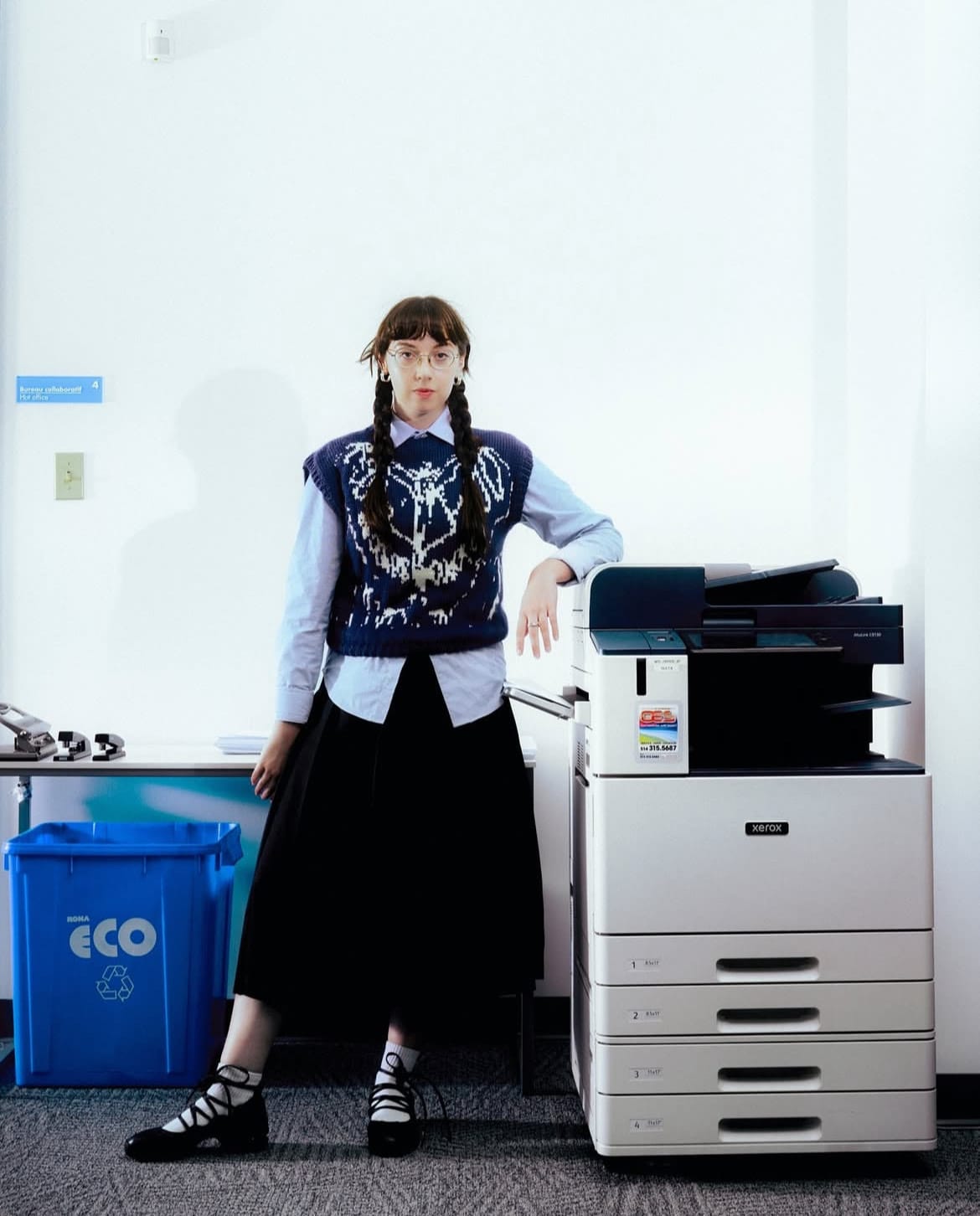 Her style, intimately and undeniably her own, is reminiscent of the aesthetics from the optimism surrounding a tech-forward future in the early 2000’s, while also belonging wholly to the hyper-digital world we inhabit now. CAPTCHAs, abstract AI-generated imagery, and cyber-influenced motifs are some of the designs you can find on various garments, pillows, bags, and tapestries that she knits by hand and machine.