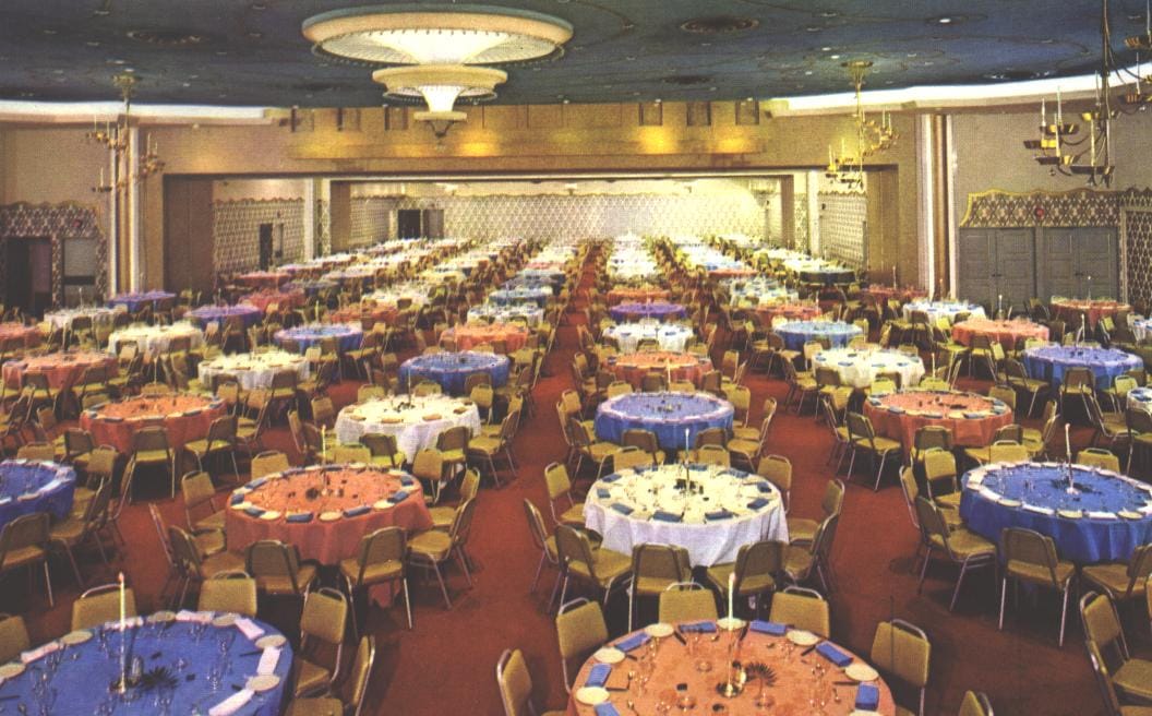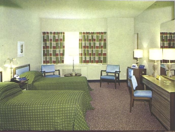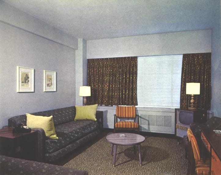 Clockwise from the lop left: The grand salon, a standard room, a 21st floor restaurant, and junior suite—all in 1958.