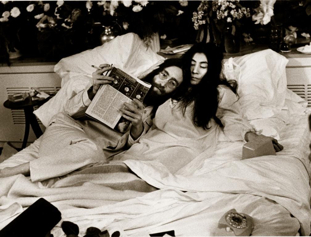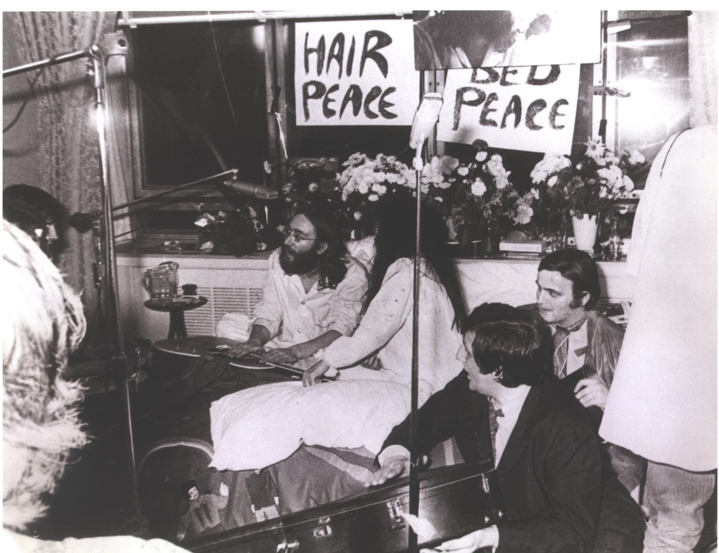 They checked into Room 1742 on May 26th and held court for seven days, throwing flower petals into the air often enough that housekeeping had to vacuum the floors several times a day. On June 1st, with local recording engineer André Perry behind four microphones and a four-track recorder, Lennon recorded "Give Peace a Chance" with Tommy Smothers of the Smothers Brothers on guitar, and Allen Ginsberg and Petula Clark among those crowded into the suite. The song peaked at number 14 on the Billboard Hot 100 and became the defining anthem of the anti-Vietnam War movement.