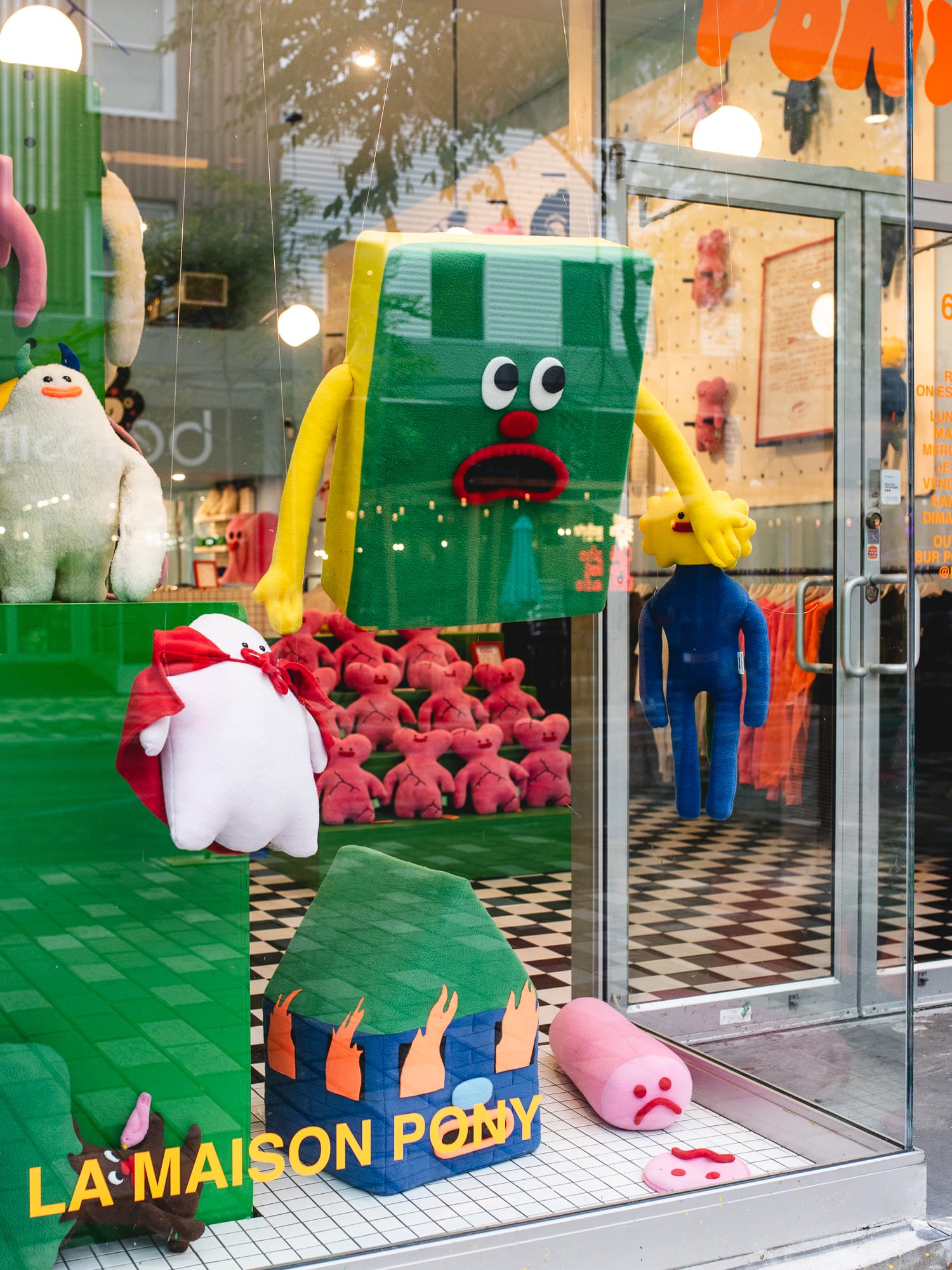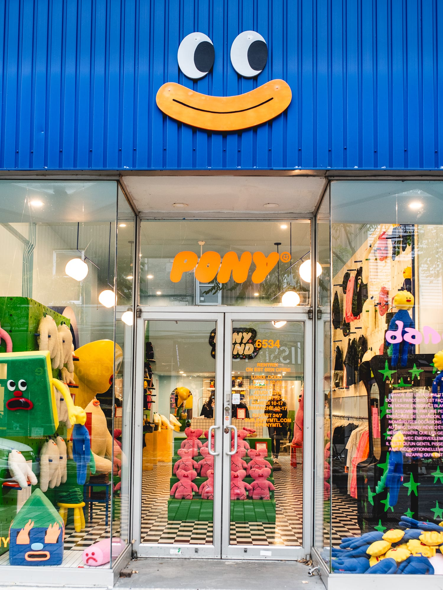 Walking up rue St-Hubert, the Pony store is hard to miss on a strip as eclectic as the Plaza with its blue exterior and an array of colourful stuffed toys on display.. The inside is bright with primary colours, recalling a fever dream from a sleepover, or the TV set from a 90s kids' show, except there’s a giant yellow penis in the corner with a smiley face on it. Instead of teddy bears, the store sells stuffed versions of characters like Anxiyeti, a figure that, according to its description on the online store, spent a lot of time alone in the forest and just wants to find people to hug.