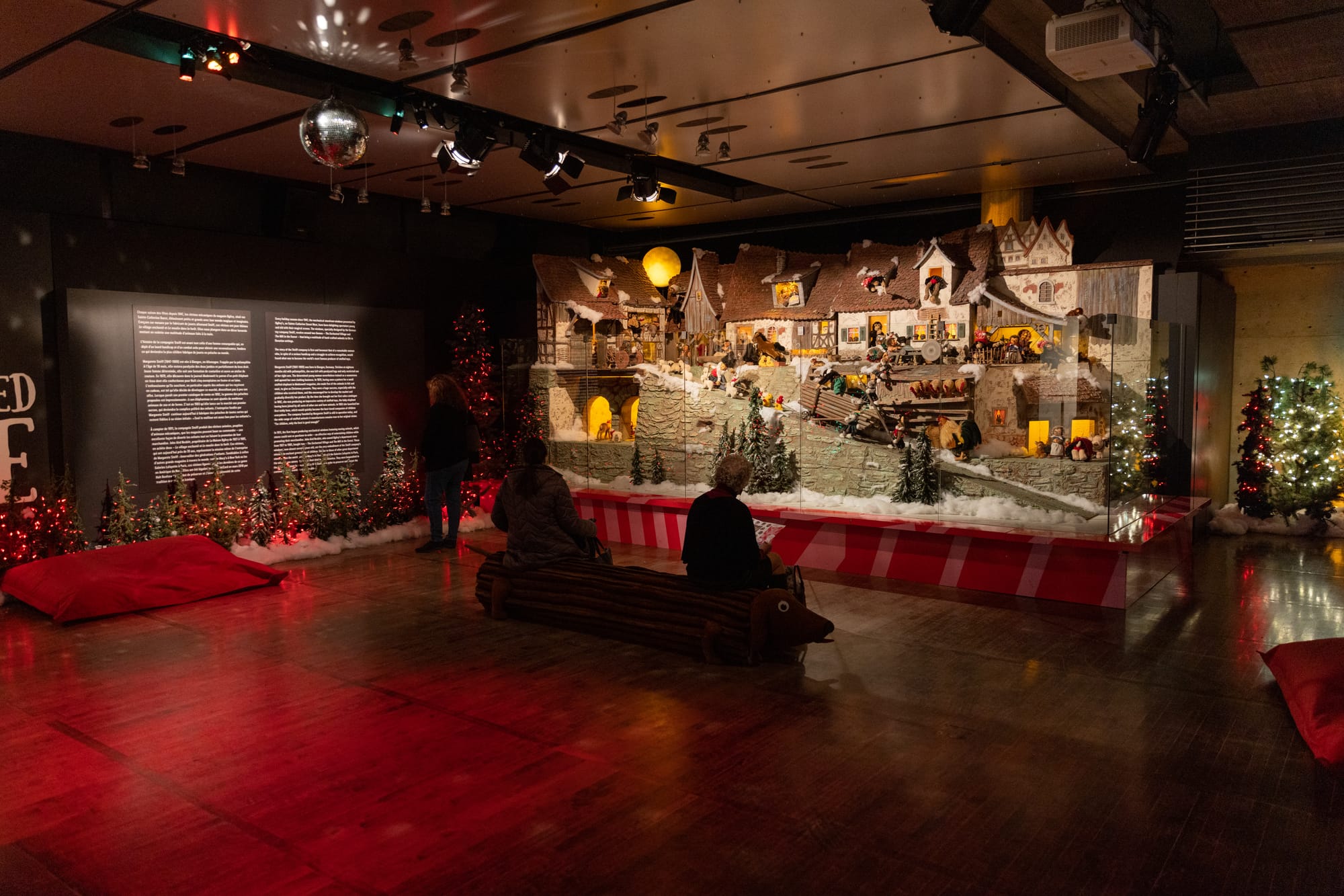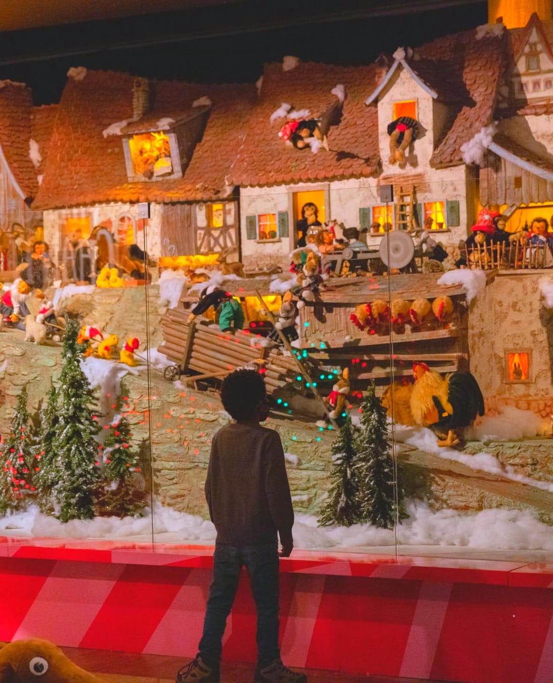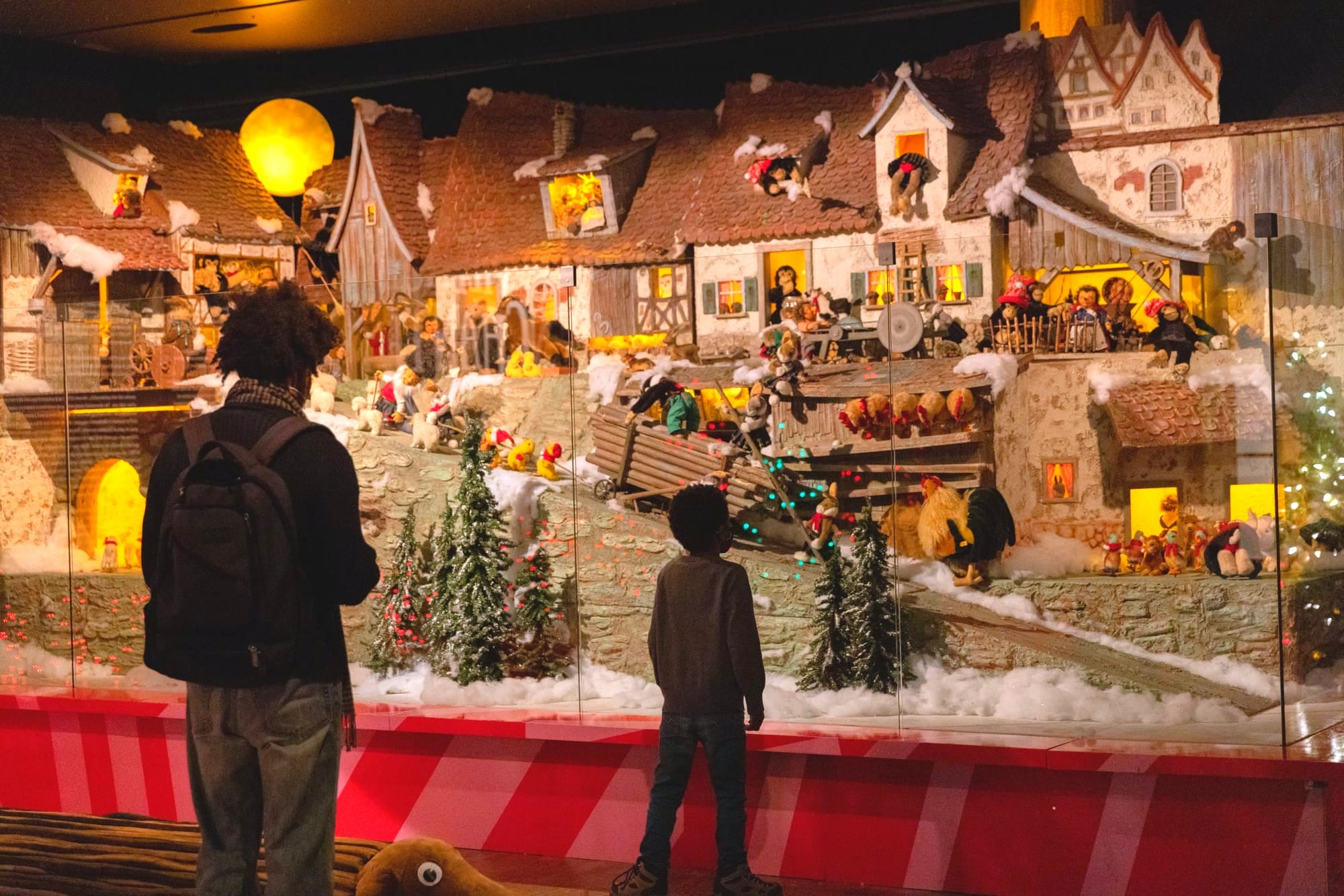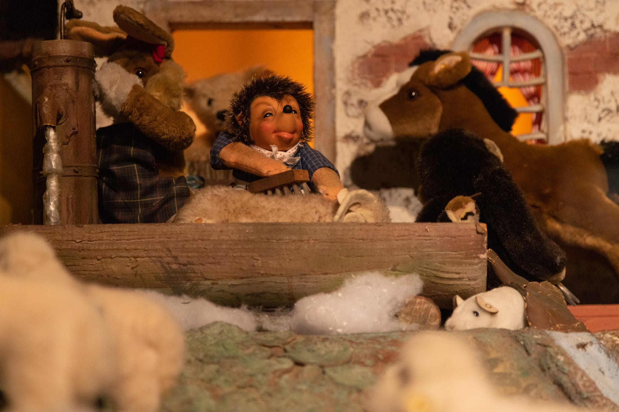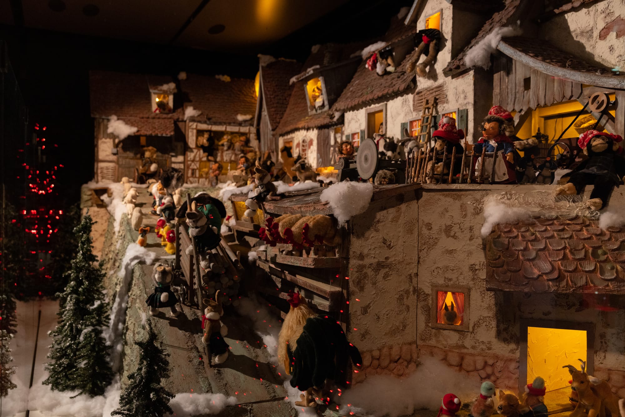 Every year since 2018, hundreds of hand-crafted animals come to life across two revived Bavarian settings: An enchanted village and a forestry mill, where teddy bears carry lumber into an Alpine building with lazy water wheel, scarved pigs nuzzle noses, carousels of ducklings spin, besuited frogs go fishing, and a monkey pulls at the reins of a pack donkey.