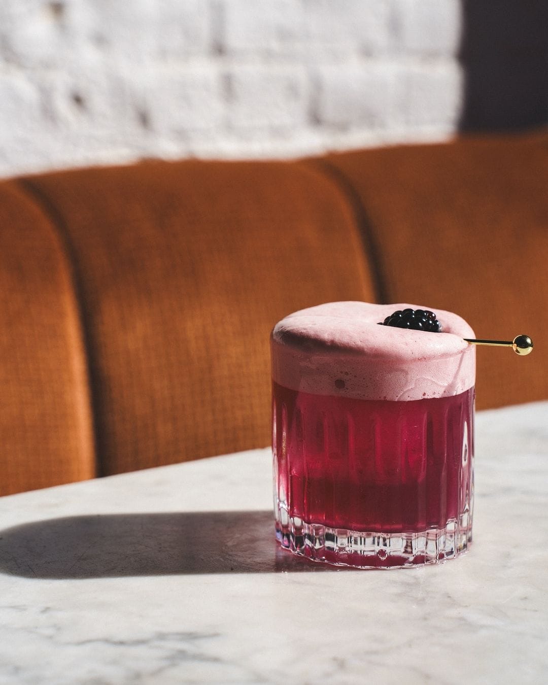 To finish: Bramble On made with Empress gin, elderflower liqueur, blackberry syrup, lemon, egg whites and vanilla.